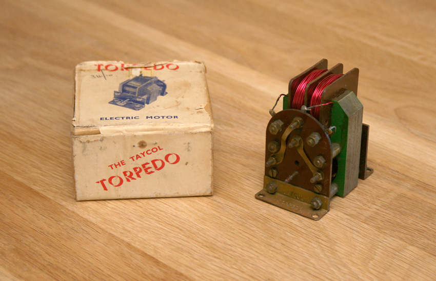 Probably the best-selling Taycol, this medium-sized motor is suitable for about a 2 ft boat. As with the Target, this motor came in two versions - the 'Torpedo', with the usual one-way wiring, and the Meteor, which had the later 'extra-reverse' coil, selectable by a brass single-pole switch. Apart from that, both these motors are electrically the same.